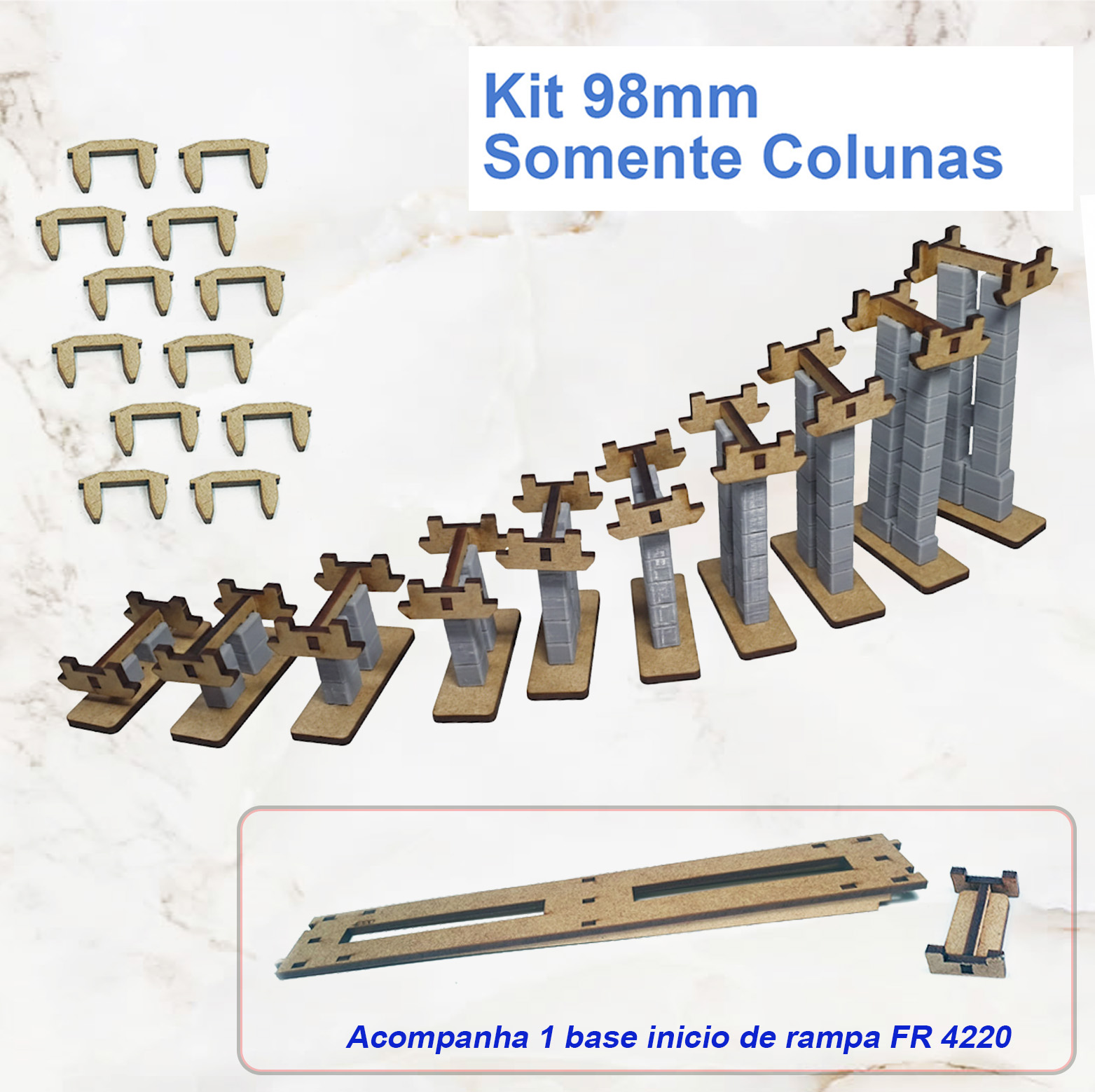Com o Kit 98mm você monta sua rampa com altura de 98mm e com lance livre inferior de 88mm. suficiente para passar vagões com 2 conteiners