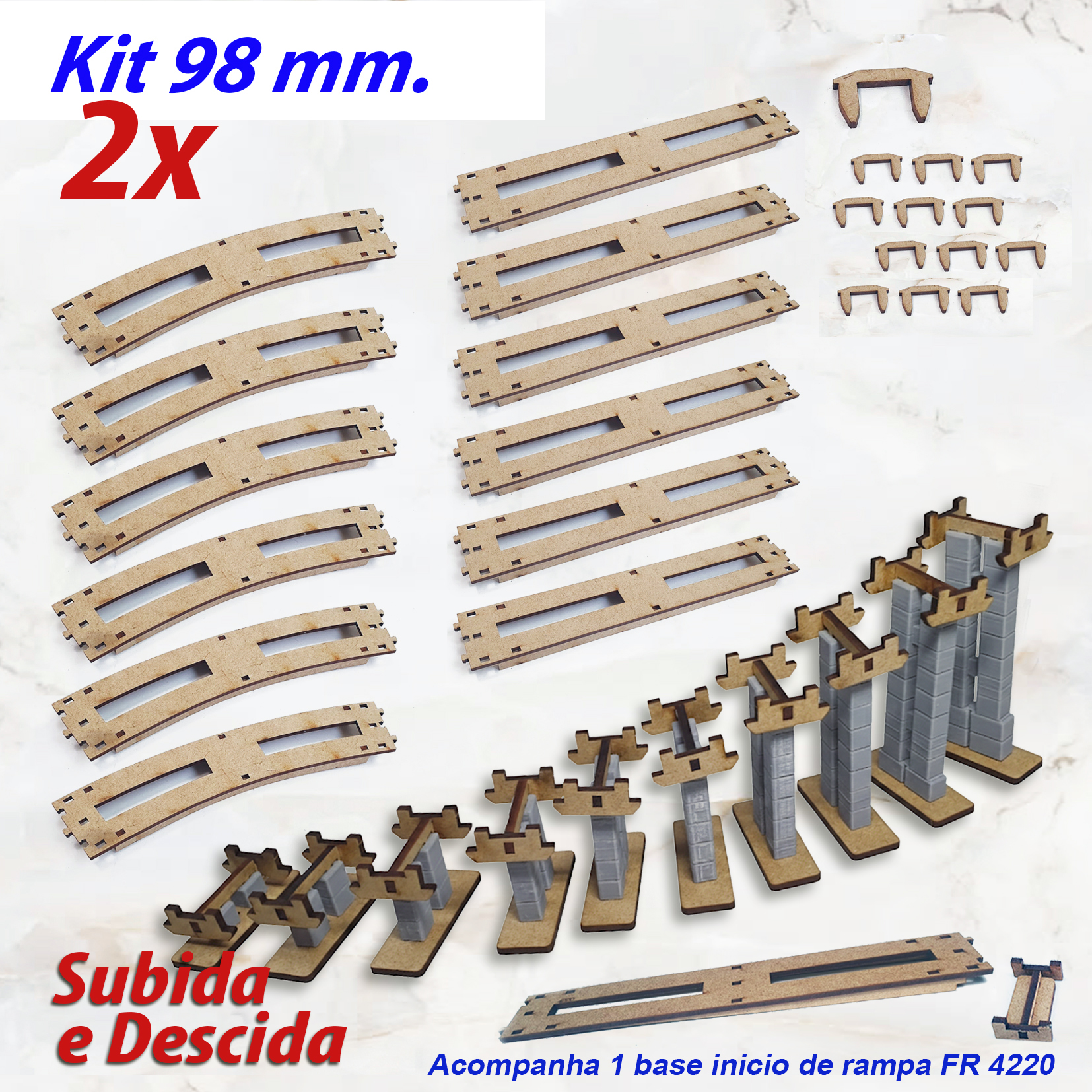 Com o Kit 98mm você monta sua rampa com altura de 98mm e com lance livre inferior de 88mm. suficiente para passar vagões com 2 conteiners